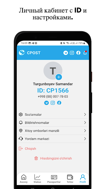 Ilova orqali ro‘yxatdan o‘tganingizda sizga 唯一 ID beriladi。 Shu ID yordamida Xitoydagi onlayn do‘konlardan istalgan mahsulotni bemalol buyurtma qilishingiz mumkin。大小 buyurtmalaringiz Xitoydagi omborimizga kelib tushadi va ilovada har bir bosqichni kuzatib borasiz: