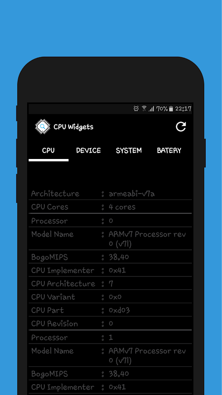 CPU Widget is a collection of CPU, RAM and Battery widgets showing live information right on your Homescreen. CPU Widget app contains 4 widgets of 4x2, 3x2 and 2x2 sizes.