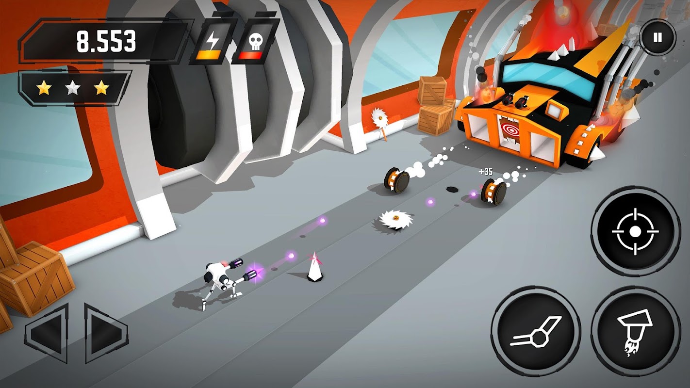 Crashbots currently features 5 different robots. The robots can be unlocked by collecting all of their parts. The parts are hidden in the levels, and some are rewarded for completing missions. You can also upgrade your robots to improve their weapon system, armor and battery life.