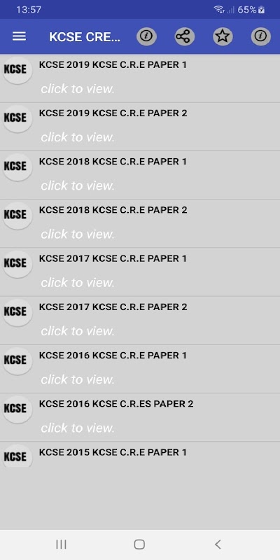 C.R.E KCSE PAST PAPERS & ANSWERS 8.4.4 mobile application provides the user of this software with C.R.E KCSE Past papers with their marking schemes. The content (topics) covered begins from form 1 up to form 4. The App especially features questions in the most recent years.
