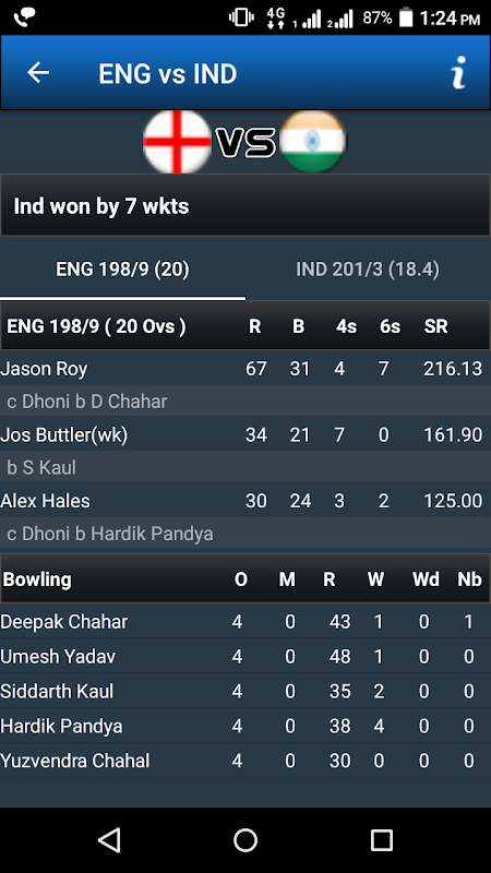 clicking any match user can see full score card of the selected match.