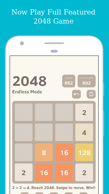 设置目标(默认为2048)。滑动以移动图块,当两个相同数字的图块触碰时,它们会合并为一个。创建目标图块时,玩家获胜!2, 4, 8 .. 16 ... 1024 .. 2048