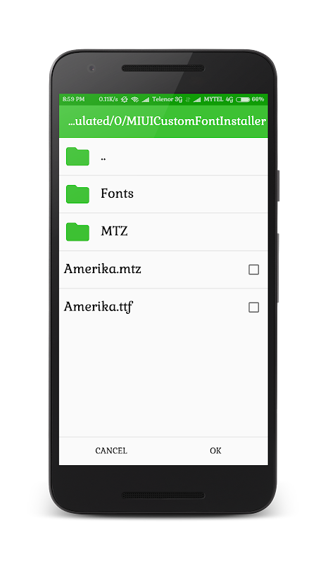 支持.ttf和.mtz(您可以从任何.ttf字体文件和.mtz主题/字体文件中安装字体。)