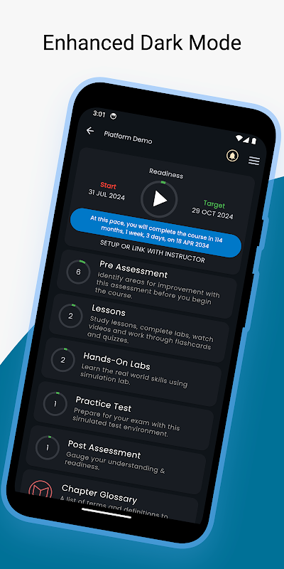 uCertify 移动应用程序和 Web 应用程序之间有统一的登录,因此您可以在设备和浏览器之间无缝移动并返回,而不会丢失任何性能或活动数据。 uCertify 应用程序在组件(包括预评估、课程、实验室、测试准备、PrepEngine 和后评估)方面与 Web 应用程序具有同等地位。它适用于 iOS 和 Android。