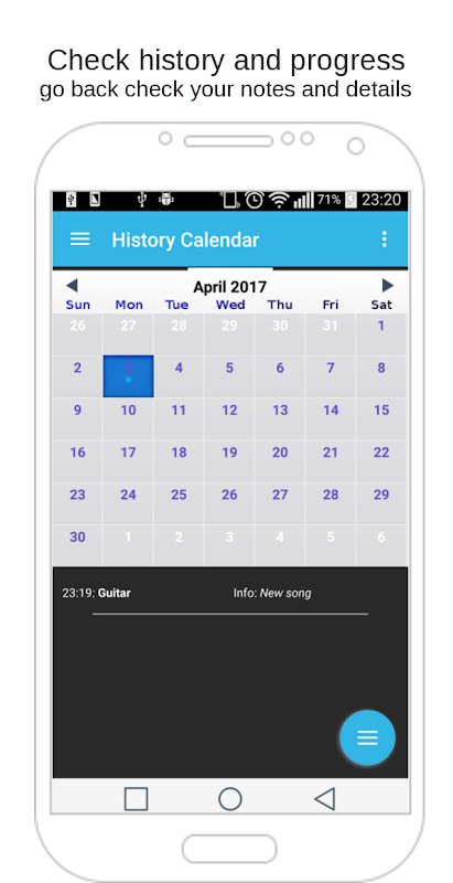 回顾历史日历中的各个事件,并随着时间的流逝获得奖励。使用统计信息可以进一步了解您的练习能力。将那首歌钉在吉他上实际上花了几个小时?能够做100个俯卧撑?学习法语。游戏化,奖励和带有日历的日历可以确保您继续精益求精。