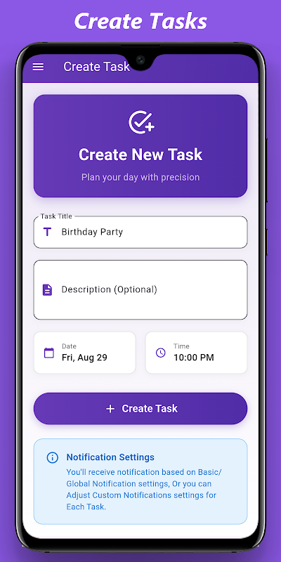 使用我们精简的界面,精准创建和管理任务。为每个任务设置具体的日期、时间和详细描述。该应用程序的日程安排系统可帮助您清晰地规划一天,确保万无一失。从重要的商务会议到生日派对等个人提醒,每项任务都能得到应有的重视。
