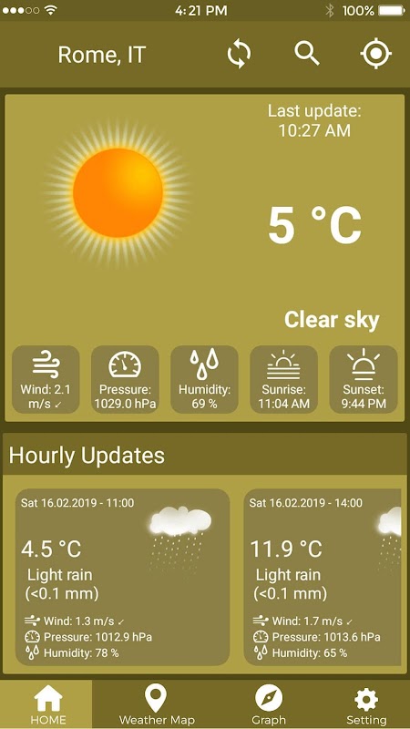 ☀️ This daily weather app weather tracker display current temperature, daily and hourly forecasts, sunrise and sunset time, humidity, wind speed and air pressure with weather today & weather tomorrow.