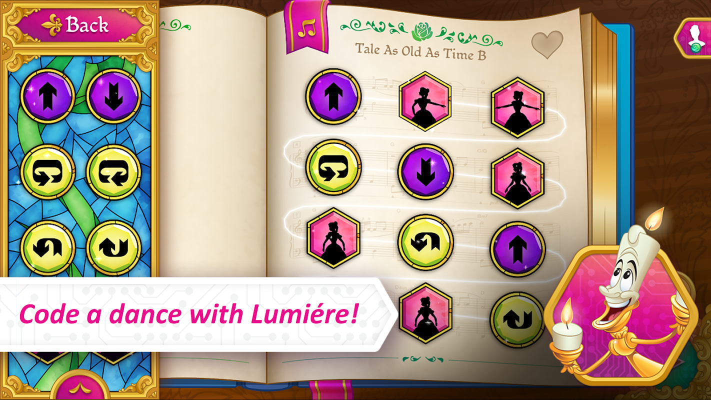 What will your dance look like? Does it have lots of twirling? Does it include big arm movements that reach out or up in the sky? You can create and save your own unique dances with this block-code style, drag and drop interface. It’s easy! Dancing is just a sequence of events (like coding) and with 13 different dance icons and 7 different music selections, you can create the ultimate ballroom dance for Belle to perform.