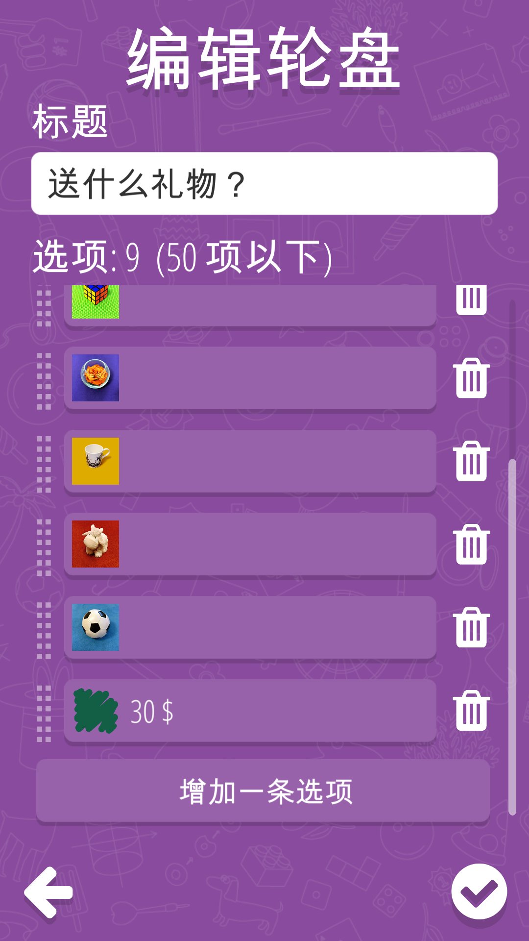 本应用免费,且简单好用。你可以用它来决定“吃什么”、“抽签”、“真心话大冒险”、“转瓶子”、……反正你说了算!你只需填好选项并转动轮盘!