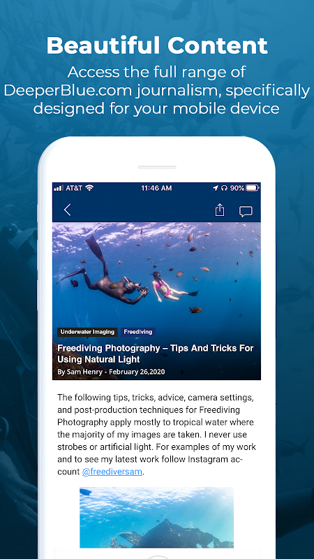每天通过官方DeeperBlue.com应用获取关于Freediving,Scuba Diving,Ocean Advocacy和Diving Travel的每日最新新闻,全面的深入文章,公正的评论以及常规功能。