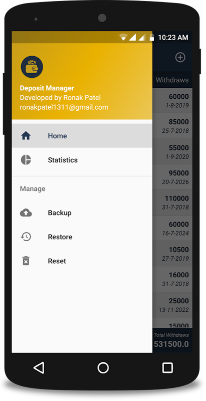 你可以很容易地将数据备份在DEPOSITE_MANAGER.db文件的形式,并把它在电子邮件/谷歌驱动器等。