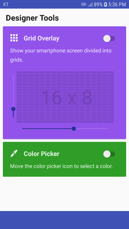 Designer tools provide a grid overlay and color picker on your smartphone screen.