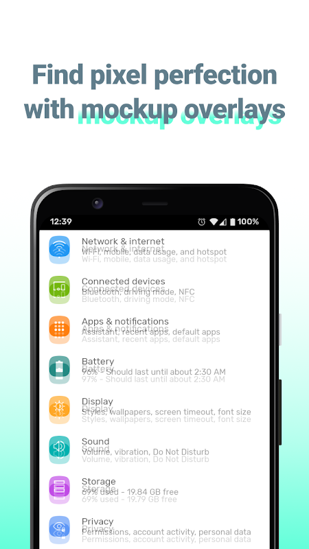 样机覆盖图 - 显示在您的应用程序一个样机图像。这给你一个高保真的机会,看到了设计规范如何发达的用户界面相匹配。选择纵向或横向覆盖和调一个比较有效的透明度。