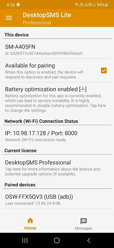 3) 在您的 Android 设备上启动 DesktopSMS Lite,然后使用 PC 上的 DesktopSMS 客户端与您的 Android 设备配对。