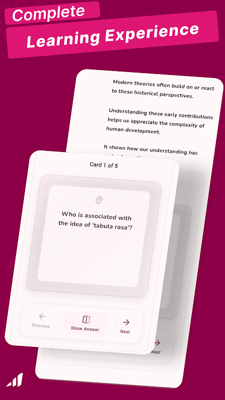 使用我们功能全面的应用程序深入了解发展心理学,它旨在帮助您轻松理解人类的成长和行为。这款应用程序非常适合学生、教育工作者或任何对心理学感兴趣的人士,提供清晰的解释、互动问题和完全离线访问。