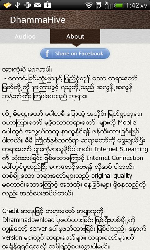 DhammaHive is another religious app for burmese people. You can easily select to monks and then dhamma to listen anytime, anywhere. But your devices need internet connection for streaming. Sure, if I got more time, I will add more monks & dhammas. Please give comments, rating and feedback for app. You could able to share with your friend by posing on your wall. Thanks!