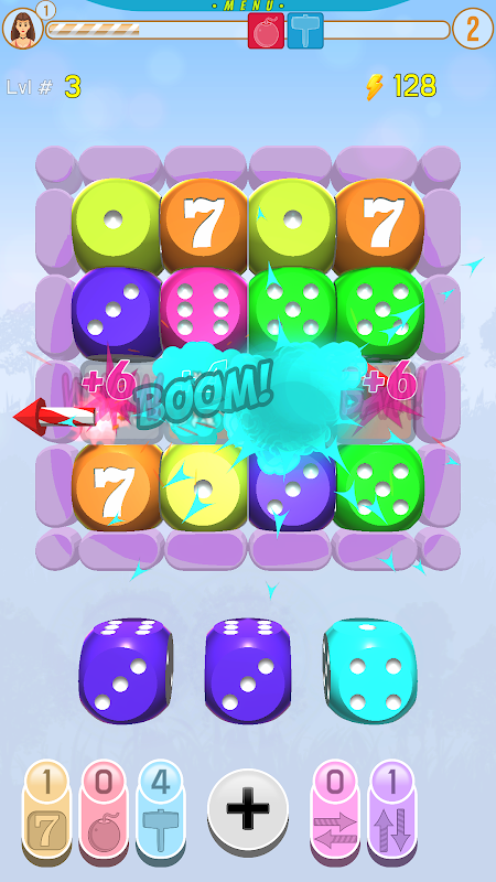遇到麻烦时,玩家可以使用助推器: 1. 强力锤 - 用直接闪电击打并摧毁任何骰子。 2. 炸弹 - 清除 3x3 区域。 3.添加一个我们可以在面板内移动的 7。 4. 火箭攻击 - 清除所有骰子的线或柱。一开始,玩家会收到初始数量的助推器,玩家通过玩更多游戏和升级,合并 m 个骰子来赢得额外的助推器。玩家可以通过单击头像图标来选择他们的头像和昵称。