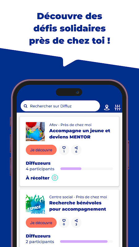 更具体地说? Diffuz 提供免费的数字解决方案,允许像您这样的协会和公民一起开展团结行动,称为“挑战”。