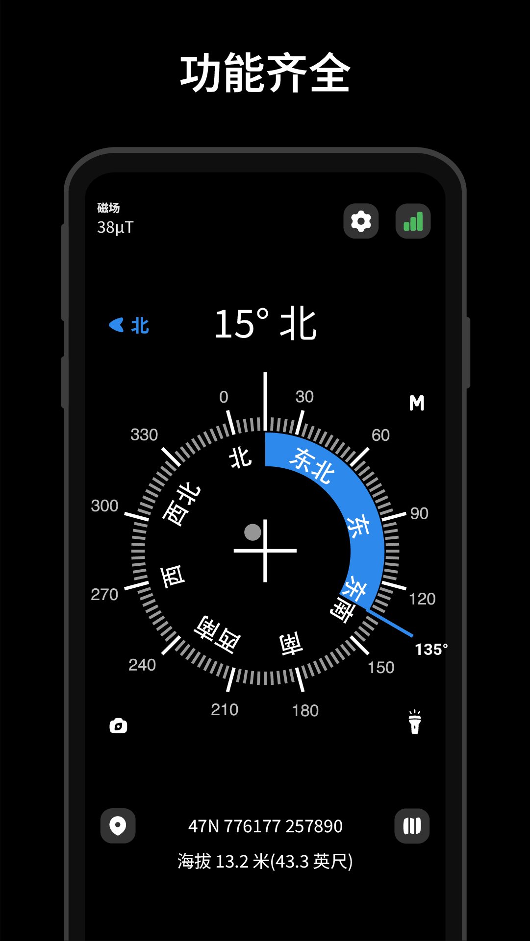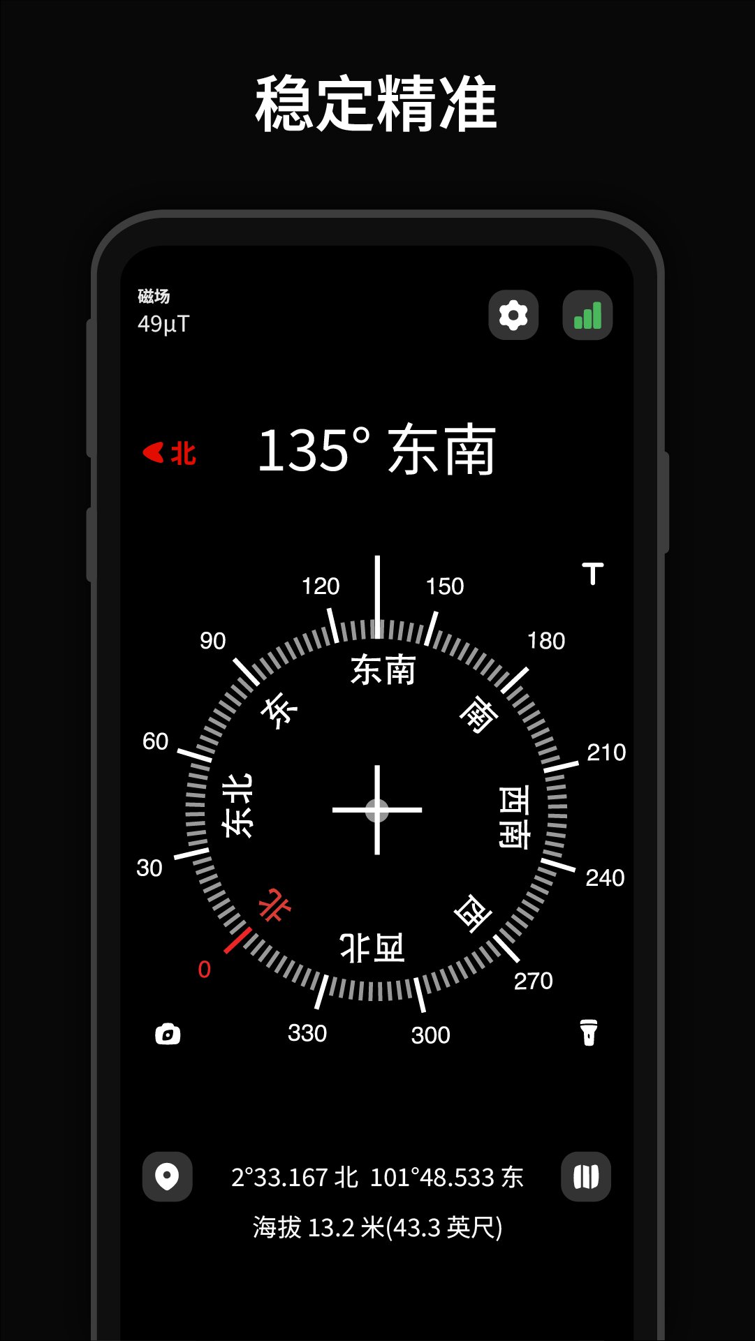 • 精准方向 – 通过方位角与角度显示当前方向。