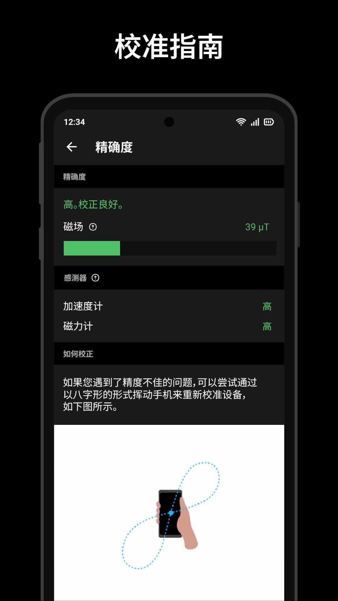 当设备靠近任何其他磁性干扰时,GPS指南针的准确性会受到干扰,请确保在使用数字指南针时远离磁性物品/设备,如其他电子设备、电池、磁铁等。如果准确性变得不可靠,请以8字形的形状翻转和移动手机以校准设备。
