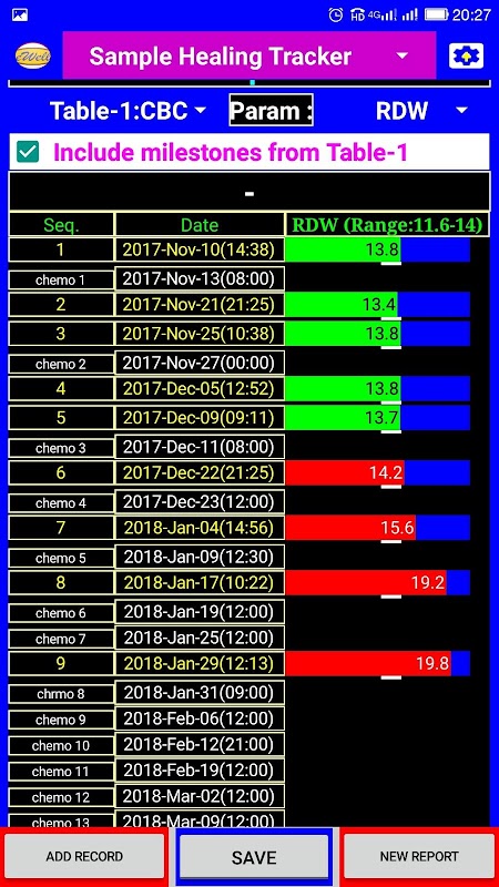 Logging, comparing and tracking pathology reports and other measured parameters- plot bar-charts to visually compare parameters along with treatment milestones.