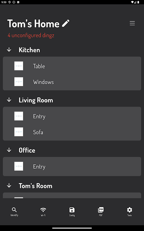 将应用程序连接到与 dingz 设备相同的 Wi-Fi,它们都会自动弹出。然后选择一个home来配置里面的dingz。从那里您可以: - 只需按一下按钮即可识别每个 dingz - 在所有 dingz 上批量配置新的 Wi-Fi 网络 - 保存所有 dingz 上的默认配置