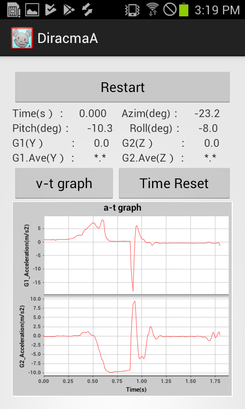 ・启动该应用程序时,它将测量智能手机的Y轴方向(纵向)和Z轴方向(垂直于屏幕的方向)的加速度变化,并创建一个加速时间图(a-t图)。另外,重新开始测量。