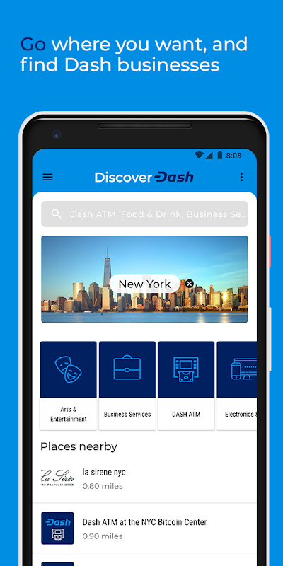 The Discover Dash app helps you discover places to spend your Dash cryptocurrency when you shop on the go, wherever you are, right from your Android device! Search for specific services and business that accept Dash, or choose from a wide range of popular categories, such as, restaurants, Technology & IT, Dash ATMs, and many more.