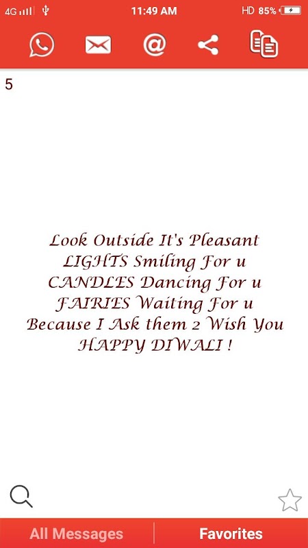 Very easy to send diwali messages to your near once. it's contains several nice diwali sms & wishes. Just choose a message by swapping on device, read it & share.