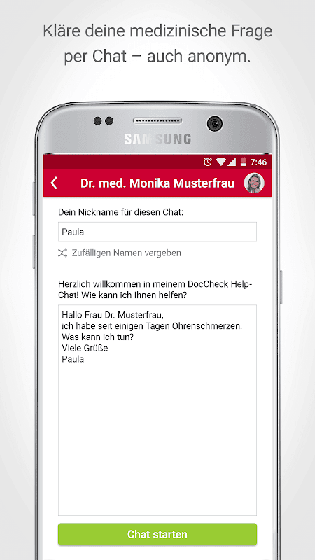 "An einem Samstagvormittag, an dem man sich eigentlich schon in einer übervollen Notdienstpraxis sitzen sieht, und man nachher mit einer Lapalie wieder nach Hause kommt, sehr beruhigend. Ich denke, so könnten einige im Endeffekt unnötige Besuche in der Notfallaufnahme verhindert werden und es bliebe wieder mehr Zeit für echte Notfälle. Weiter so!" (Chat mit Dr. med. Marion Eckert, Fachärztin für Kinder- und Jugendmedizin)