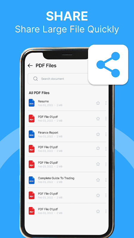 Word 和 PDF 文档阅读器允许您在一个地方访问和查看不同类型的文件,包括 PDF、Word 文档、Excel 表格、PPT 文件和 TXT 文件。使用文档阅读器或 PDF 阅读器,您可以完整地显示文档,并根据需要轻松查看、阅读和共享文件。使用文档查看器和图像转 PDF 转换器应用,您可以在手机上查看文档文件并舒适地阅读。