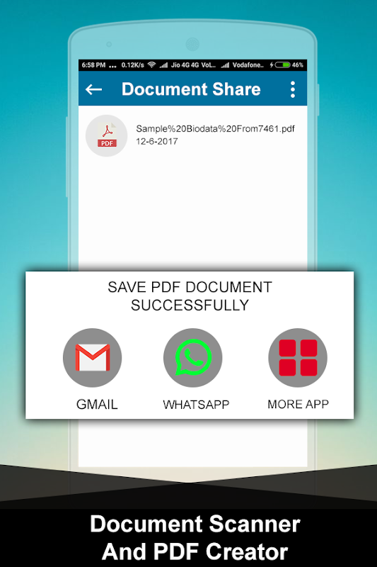 Save and Share :- Once you've Scanned and Converted your Document into PDF you can save this PDF Document on your phone and share via Email and other social media.
