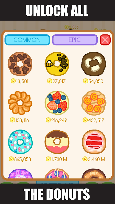 Use rare and powerful epic donuts to maximize your earnings. Offline production lets you continue playing even when the game is closed. When you come back, use all of your money to get rich and buy new donuts and upgrades.
