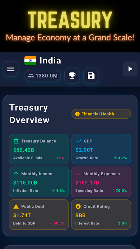 在这个身临其境的地缘政治战略模拟器中指挥国家的命运!从新兴力量开始,通过战略掌握上升到顶峰。DOWGE - 世界超级大国模拟器让您掌控一个国家的命运。做出有关经济、军事、基础设施和社会政策的关键决策,将您的国家转变为全球超级大国。