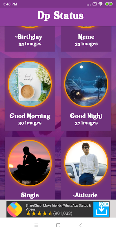 有了这个应用程序,您现在可以与您所爱的人表达您的感受。将着名的名言保持为DP状态有一种新的趋势。我们在类别中区分了图像,以便您可以快速找到图像。您可以直接从应用程序将图像设置为墙纸或DP。您也可以通过应用程序本身与朋友分享图像。