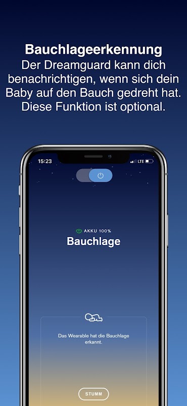 •腹部位置检测:如果您的宝宝在睡觉时从肚子转向肚子,Dreamguard会立即向您发送信号。对于在肚子上睡觉的婴儿,可以轻松关闭此功能。