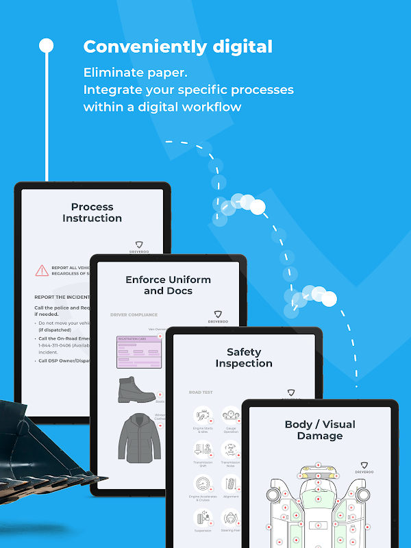 Driveroo Inspector 是一款功能强大且易于使用的数字检测软件,可在任何手机或平板电脑上使用。 Driveroo Inspector 通过视觉输入技术简化了检查过程,并以易于共享的综合报告形式呈现检查结果,并附有图片和建议。