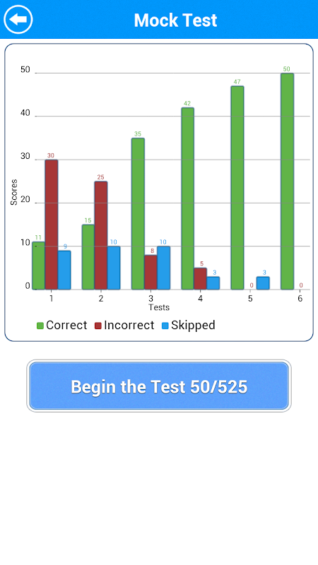 A summary of the practice test is presented at the end of each test. It shows you the time you took, the score, which questions you answered correctly and where you were wrong, explanation for all questions.