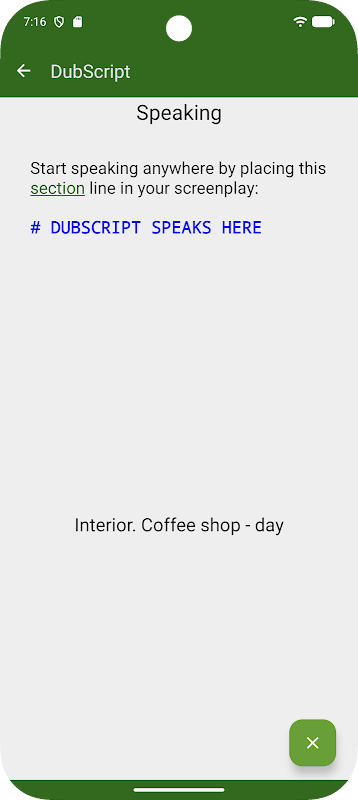 完成了吗?只需轻轻一划,DubScript 就能帮你完成繁琐的格式设置!缩进、分页符、“CONT'D”、页码、页边距和文本样式都会神奇地自动生成!