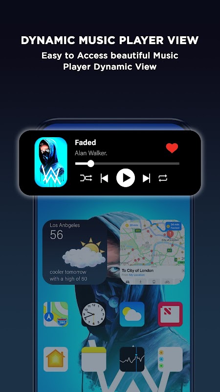Dynamic Island - iOS 16 应用程序用于自定义摄像头孔周围的胶囊缺口切口效果,指示来自应用程序和系统的通知,与 iOS 16 相同。快速访问通知,管理音乐播放器,轻松识别新通知。
