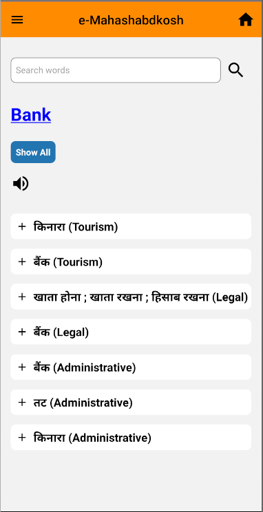 e-Mahashabdkosh 是基于领域的双语和双向英语-印地语发音词典。它包含英语词根的印地语等效术语,反之亦然。单词的详细信息包括印地语和英语的描述、印地语和英语的用法、词根的发音。 e-Mahashabdkosh 应用程序由 Rajbhasha Vibhag 和 C-DAC Pune 开发。