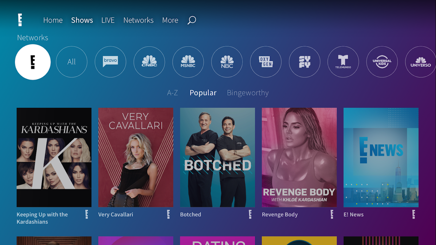 获取 E! 必知的流行文化节目的完整剧集,例如与卡戴珊姐妹同行、Total Bellas、The Bradshaw Bunch、Botched、Live from E!并一直加载更多新内容。所以停止阅读并开始观看。