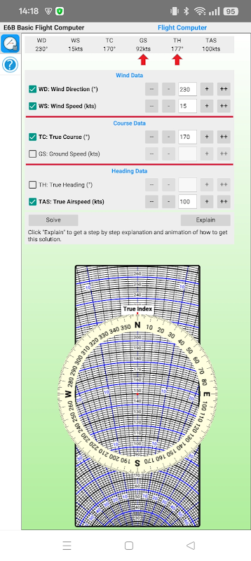 这款应用通过允许您输入六个数值中的四个(三个速度和三个角度)来解决风三角问题,并计算剩余的两个数值。然后,它会通过动画演示如何使用飞行计算机得出这些结果:旋转圆盘、滑动圆盘并添加标记。它还会显示每一步求解所需的数值。