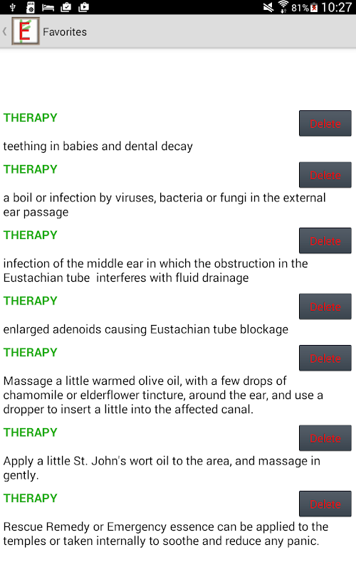 Finally, tap on Your Therapy. You will see a list of symptoms (in orange) mixed with a list of remedies (green) that you have selected. Taken together, the symptoms and the remedies form your therapy. Now all you have to do is obtain the remedies and start the process of eventual improvement of your health.