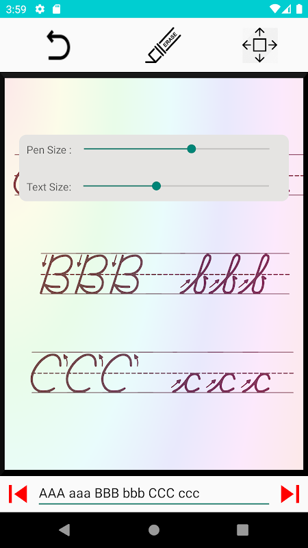 4.从简单的单词开始。放大以调整工作表的字体和笔的大小。继续输入所有练习文本,然后可以使用后退n个前进箭头再次练习n次。