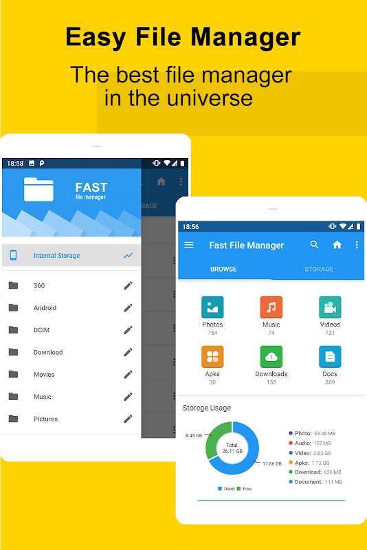 Easy File Manager is a powerful Android file manager, clear classification allows you to find pictures, video, music, documents, installation packages, compressed packages and other files quickly, supporting global search, delete, create, copy, cut, rename, share and other file operation functions on the mobile phone memory and SD card. We also provide a convenient garbage collection function, so you can easily clean up the excess files, folders and application cache on the phone.
