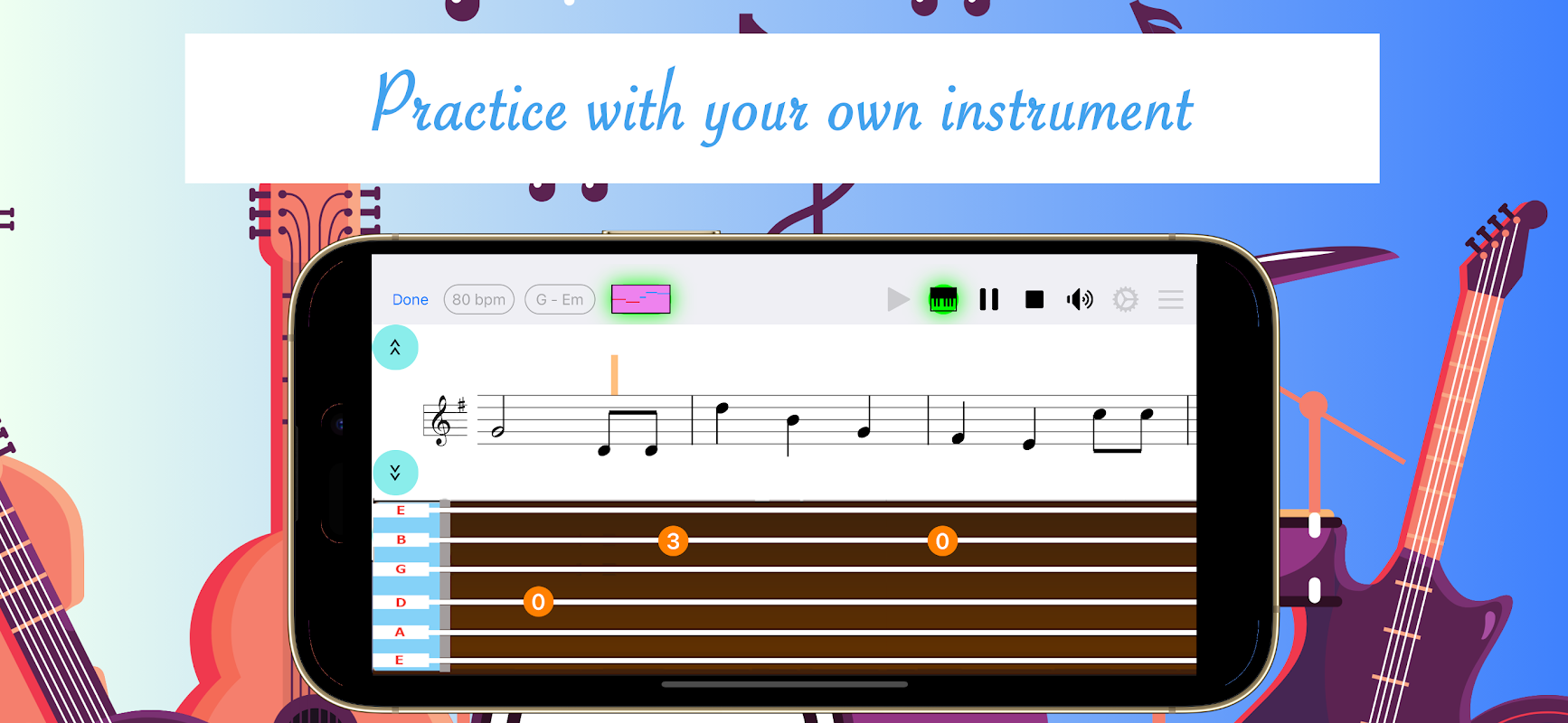 - 两种练习模式:单独逐个音符练习,或练习以正确的速度演奏歌曲。