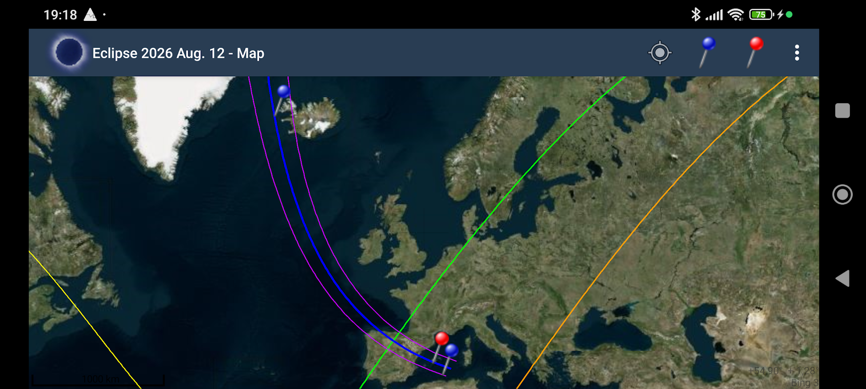 为了选择最佳观看点,该应用程序提供了增强现实视图。日食的进展会投射到您设备的生活相机照片上。这样您就可以避免被树木或建筑物挡住视线,并选择欣赏整个日食的最佳地点。