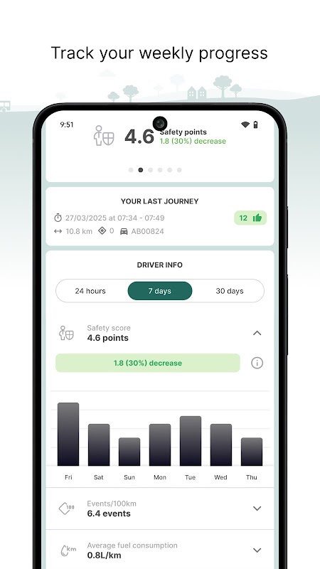 EcoSafe 为驾驶员提供了跟踪其驾驶表现的方法,为他们提供包含突出安全事件的旅程历史记录,例如:急加速、急制动、急转弯以及某些情况下的碰撞检测。