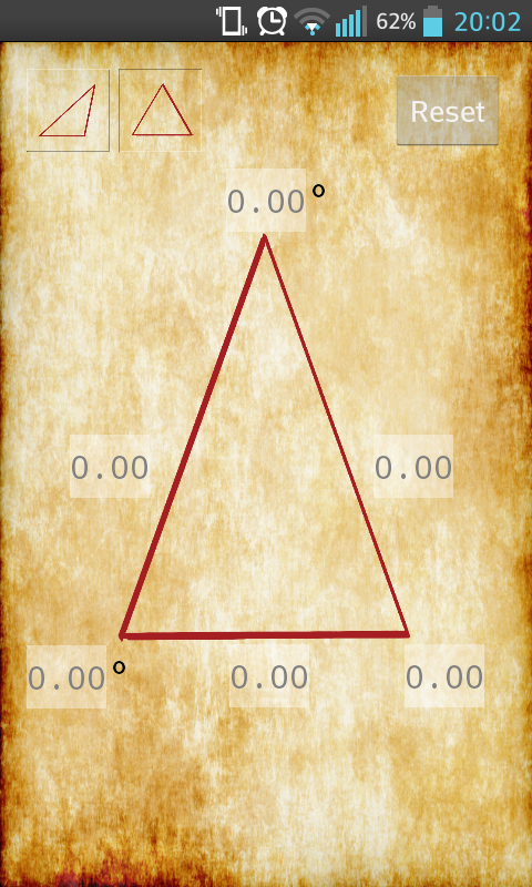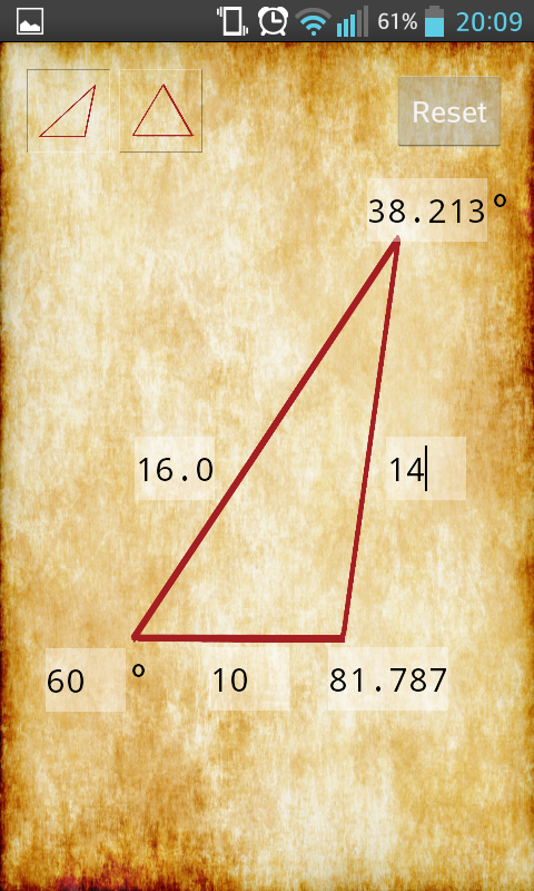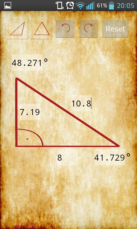 输入两个参数(长度或角度)为直角三角形或三个参数为不等边三角形。该应用程序会做所有的休息。
